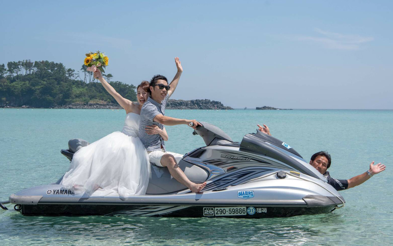 普段あまり触れることのないジェットスキーを用いて、壱岐の綺麗な海をローケーションに結婚式の前撮り、後撮り撮影を行います。